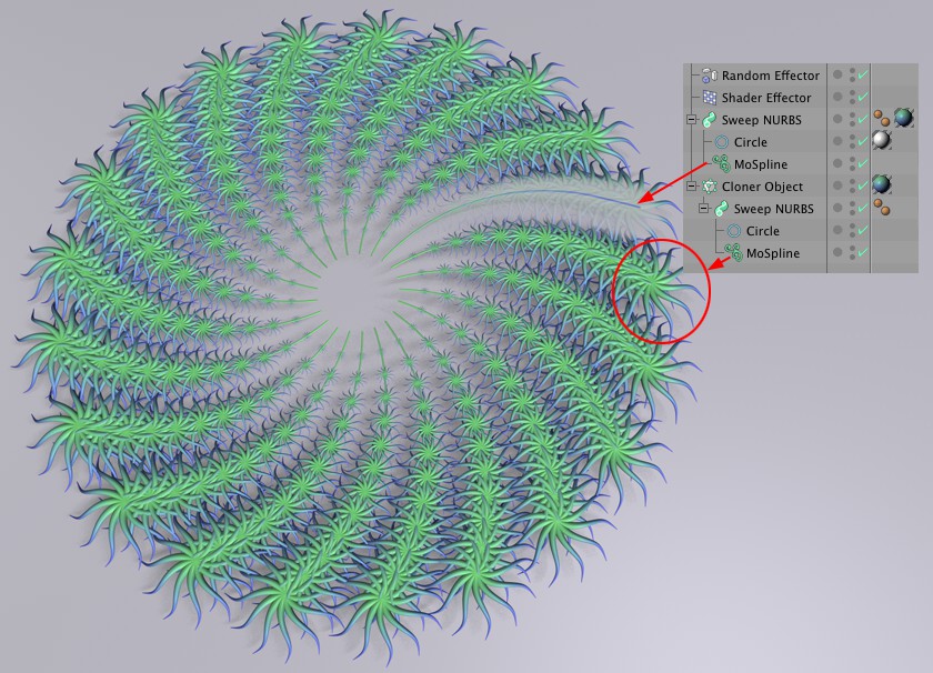L’objet MoSpline peut être utilisé partout où il y a des Splines. Des objets peuvent être placés sur un objet MoSpline par le biais de l’objet Cloneur. Si l’objet Cloneur clone aussi à son tour des MoSplines, il est possible de créer la structure suivante en forme de plante :