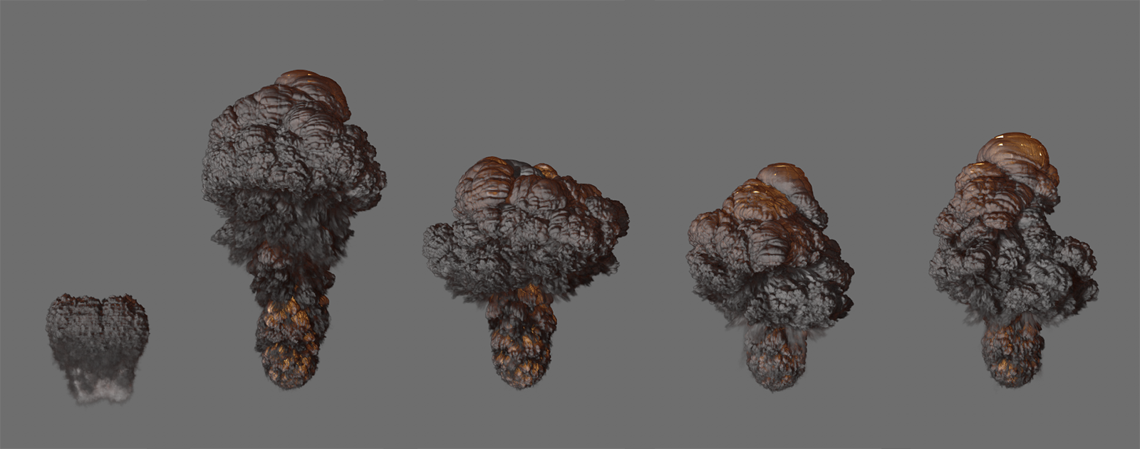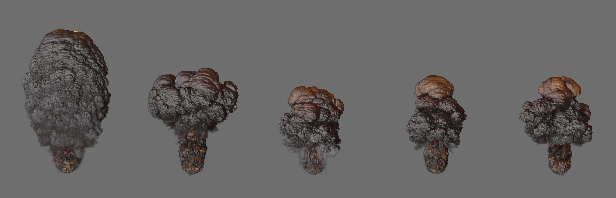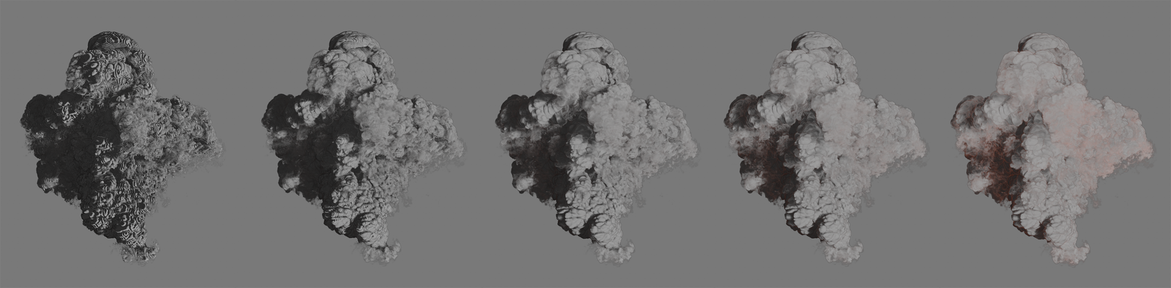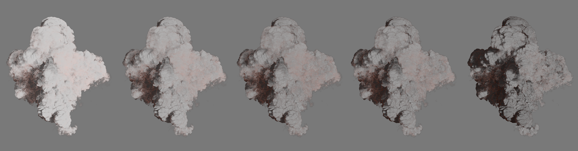 Ici, une simple émission de densité a été simulée sur la moitié supérieure d'un cylindre. Toutes les images montrent le même cadre de la simulation. La seule différence est le changement de la dissipation de la densité absolue. De gauche à droite, les valeurs 0, 1, 2, 3 et 4 ont été utilisées pour cela. La valeur de la dissipation de la densité relative a été fixée à 0 ici pour plus de clarté. Il est clair que l'augmentation de la diminution absolue de la densité entraîne un écrêtage brutal et très contrasté de la simulation.