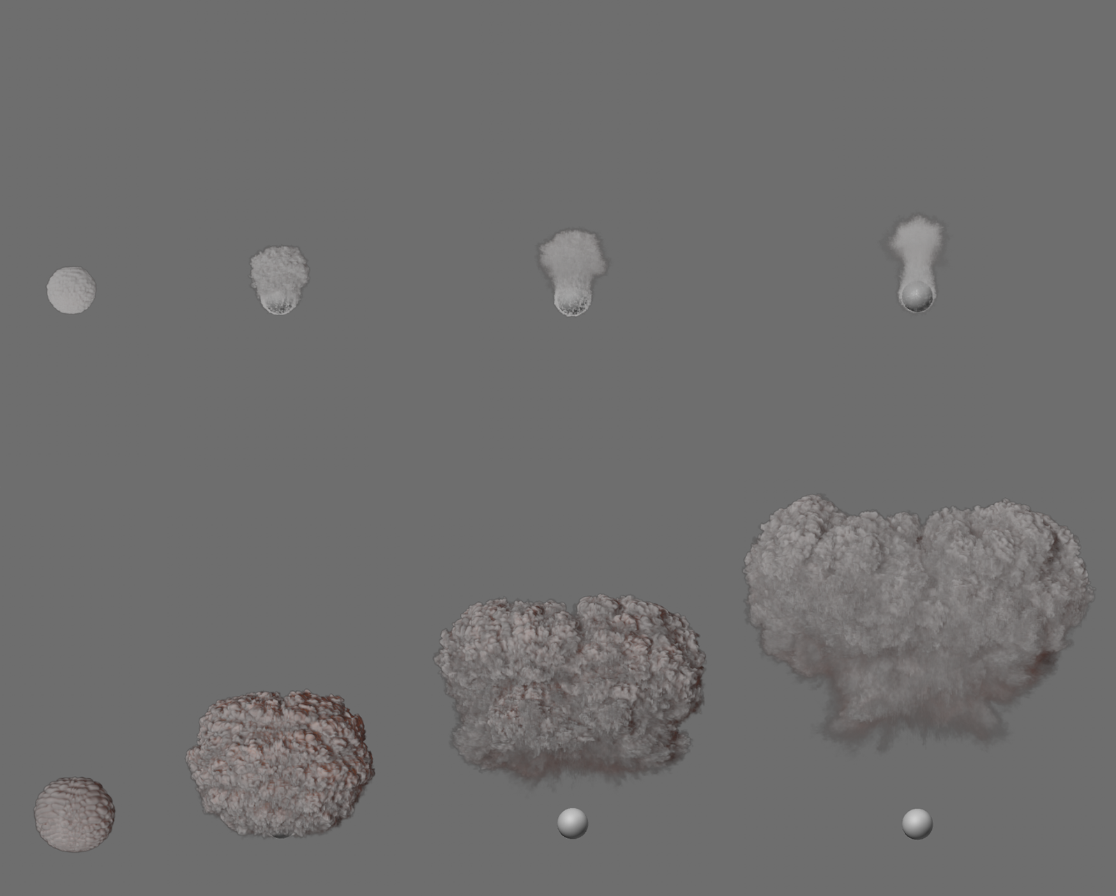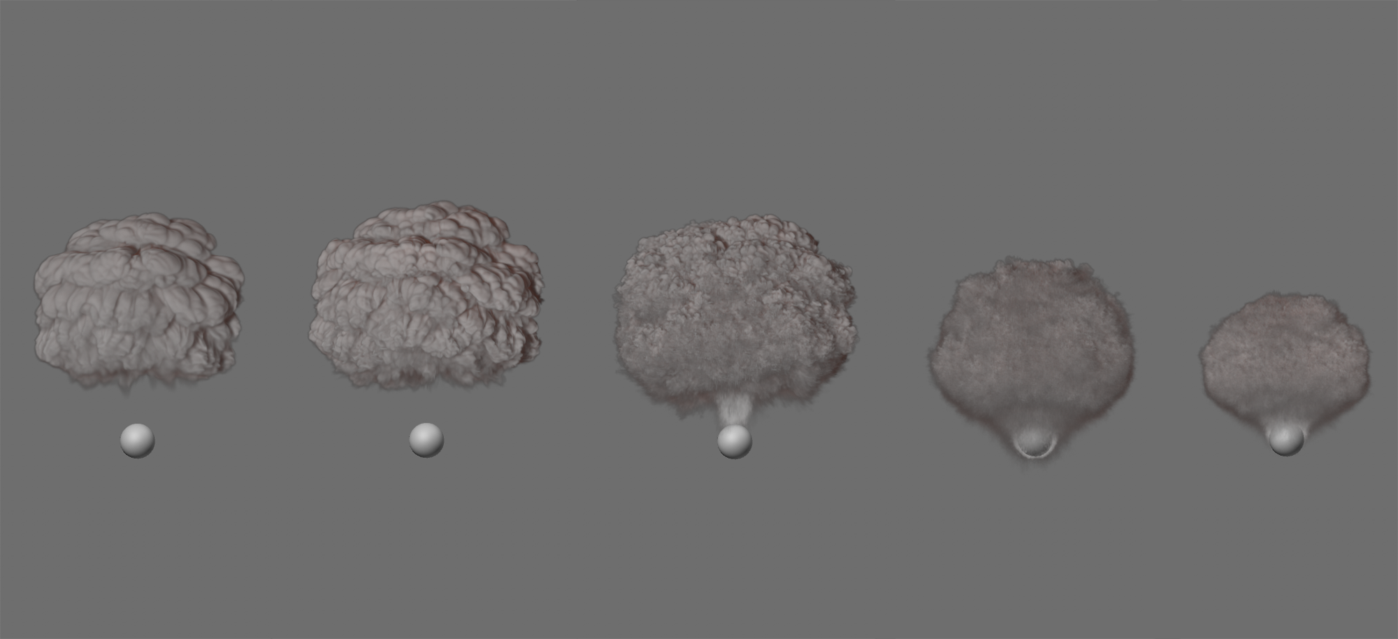 Ici, la densité n'a été générée que sur une sphère. Une intensité de poussée élevée et un seuil de source très bas ont été utilisés. Le résultat est visible à gauche avec une petite portée de poussée et à droite avec une grande plage de poussée. La fumée est plus ou moins dispersée.