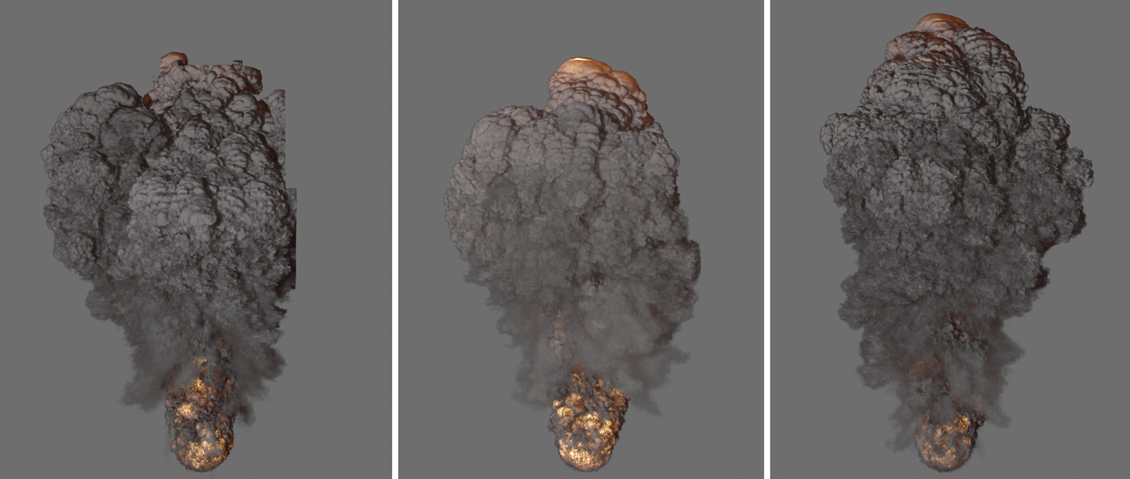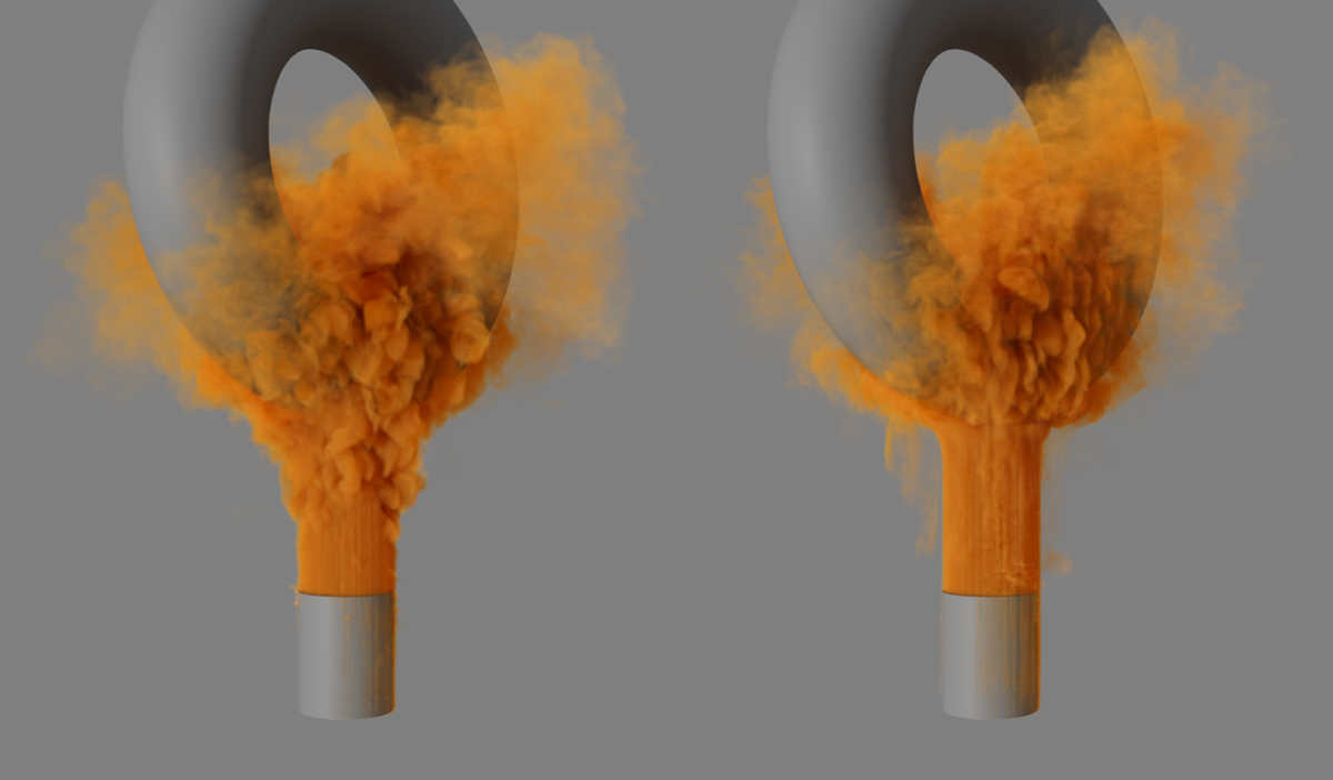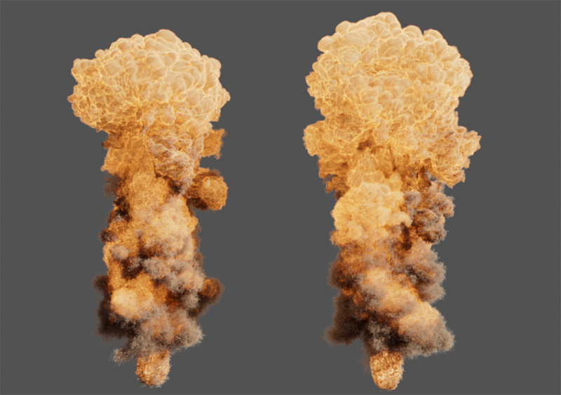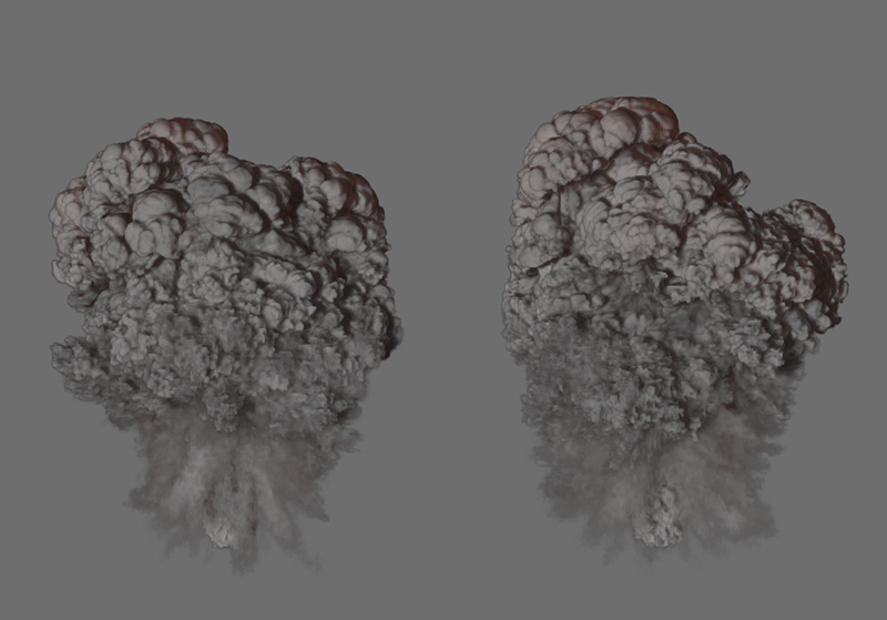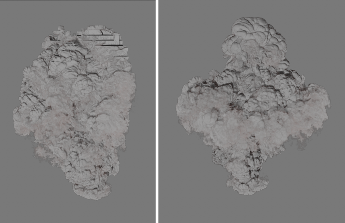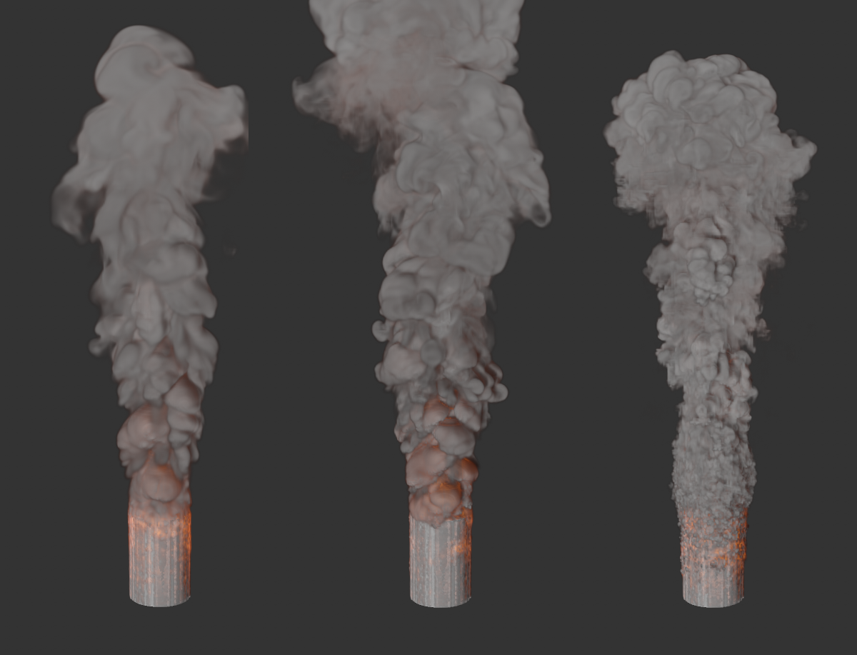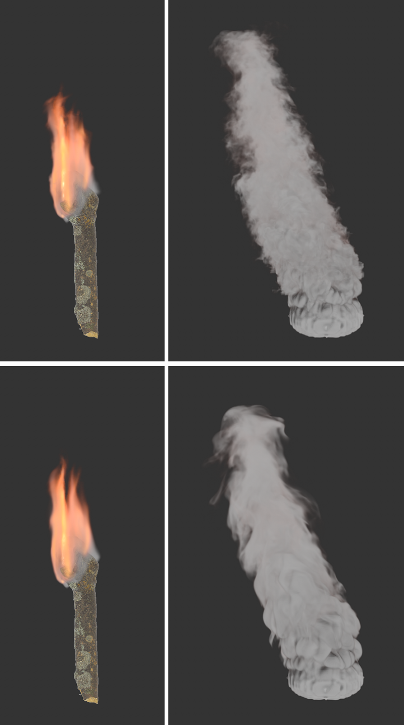 À gauche, vous voyez une simulation avec une flottabilité de la température de 0,1, à droite la même simulation avec une valeur de -0,1. La flottabilité de la densité est de -2 dans les deux cas, mais la fumée du côté droit descend également avec la température la plus élevée.