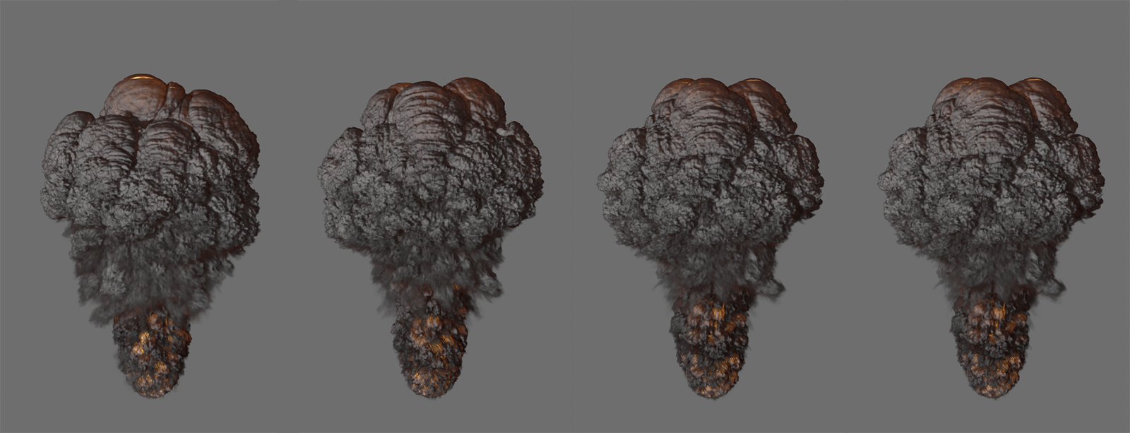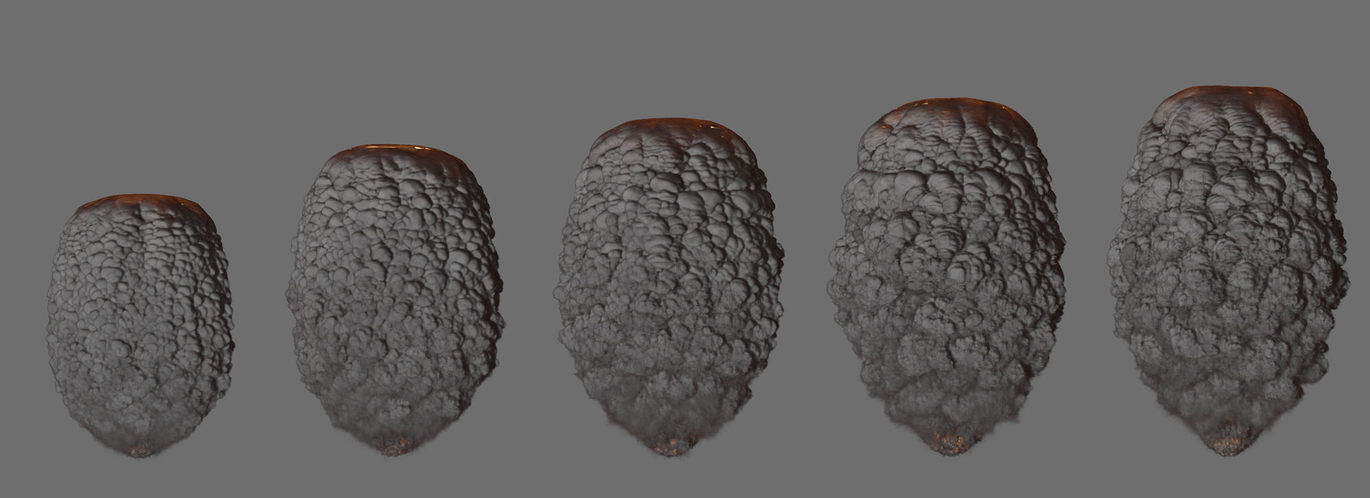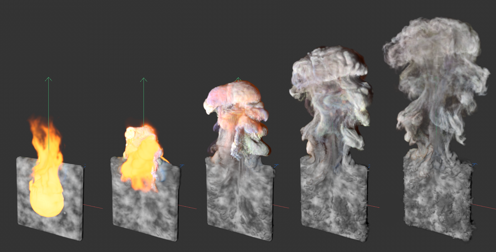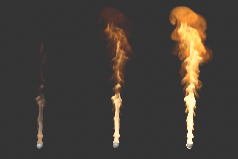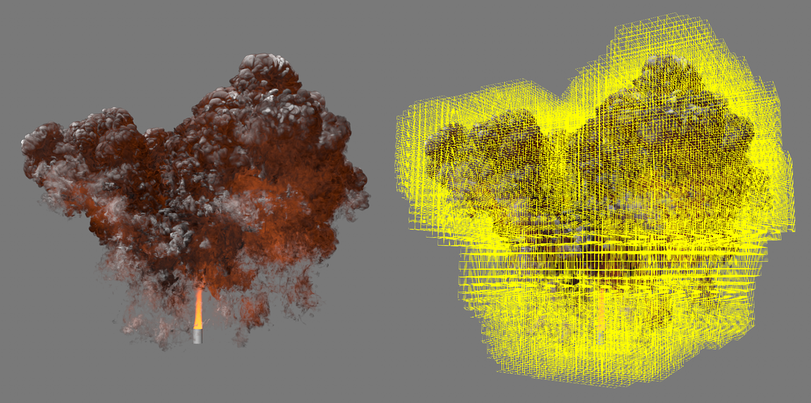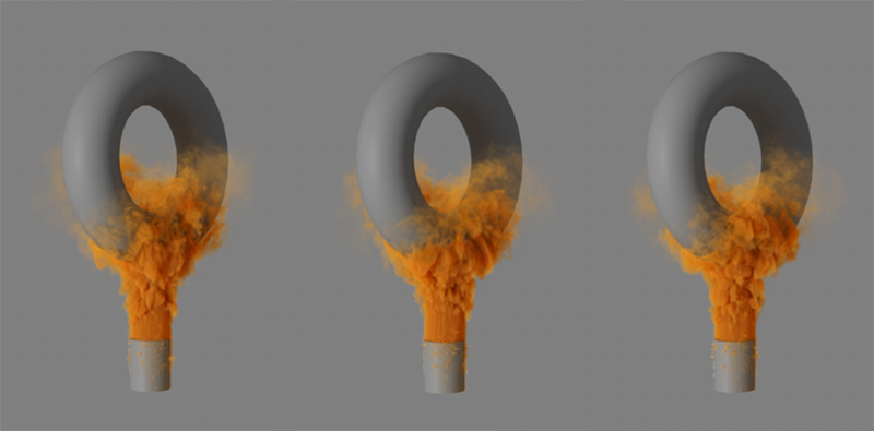 L'image ci-dessus montre que non seulement le niveau de détail de la simulation change en raison de la taille réduite des voxels, mais aussi que la simulation elle-même montre des températures différentes et une distribution différente de la densité. En effet, dans ce cas, les espaces entre les protubérances de l'objet émetteur ne peuvent plus être détectés avec autant de précision par les Pyro-Voxels de plus grande taille. La quantité de densité émise et la concentration de température émise sont donc plus imprécises et, dans cet exemple, conduisent à une flottabilité légèrement plus forte et donc à une colonne de fumée et de feu plus élevée lors de l'utilisation de voxels plus grands.