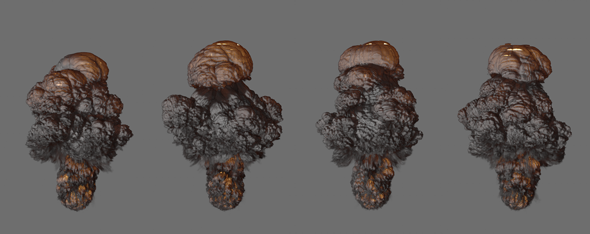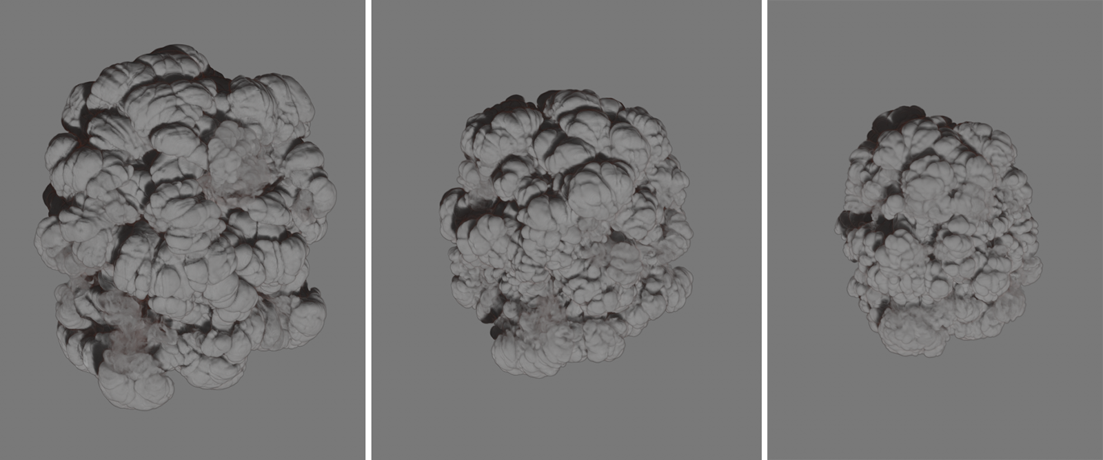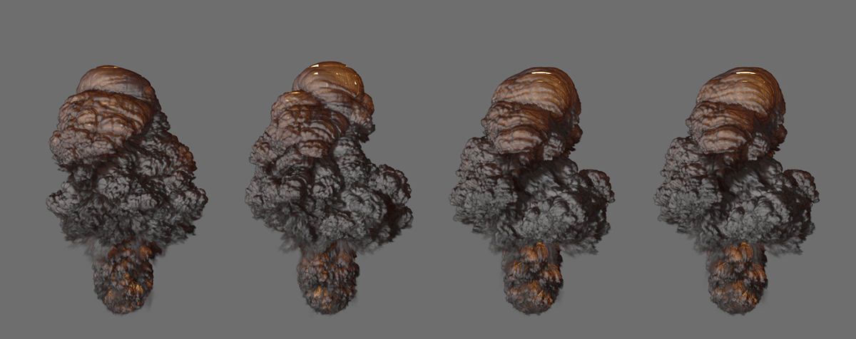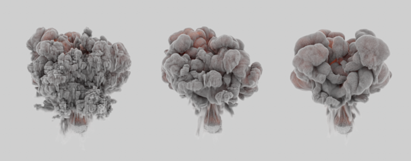 Vous pouvez voir ici les mêmes paramètres de simulation d'une explosion et la même image de la simulation dans chaque cas. 1 Sous-étape a été utilisé à droite, 4 au milieu et 8 à droite. En augmentant le nombre de pas, vous obtiendrez plus de détails, en particulier dans les zones de la simulation qui se déplacent plus rapidement, et vous obtiendrez un résultat plus réaliste dans l'ensemble.