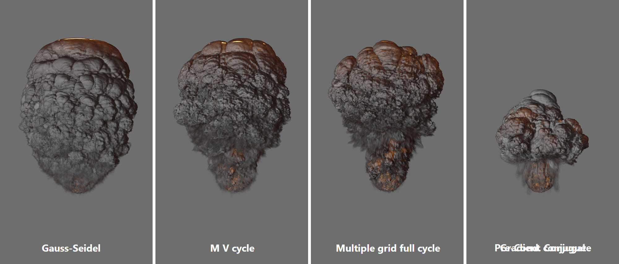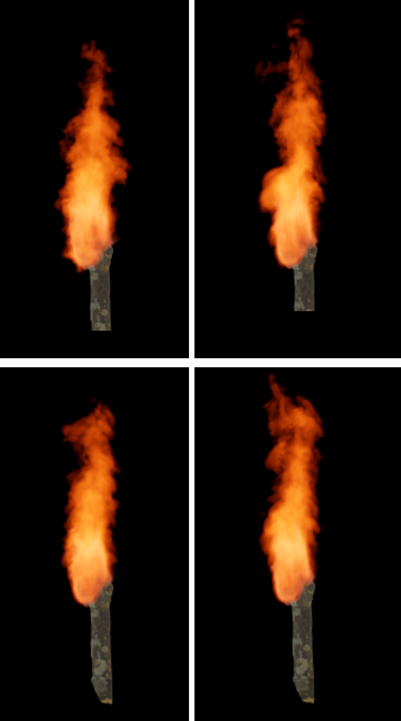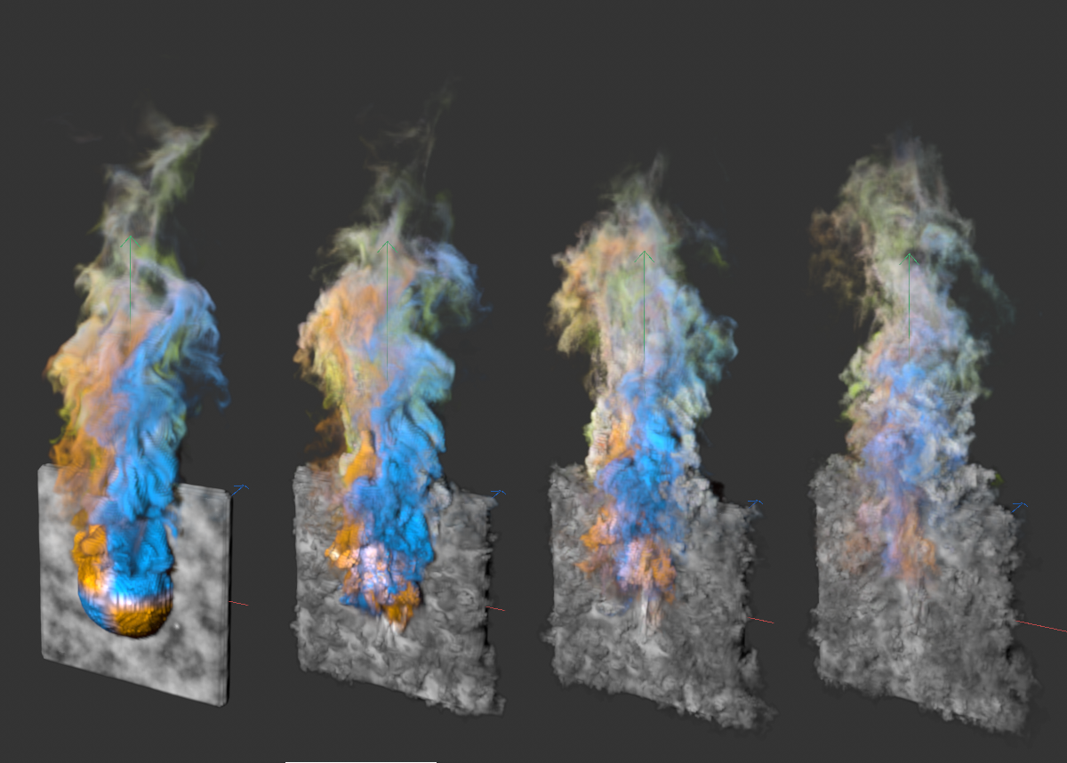 La vidéo suivante montre, de gauche à droite, des valeurs de force légèrement croissantes pour la répulsion de la composante Température d' une simulation. Il en résulte un refroidissement plus rapide de certaines flammes et donc une formation plus rapide de la fumée (densité).