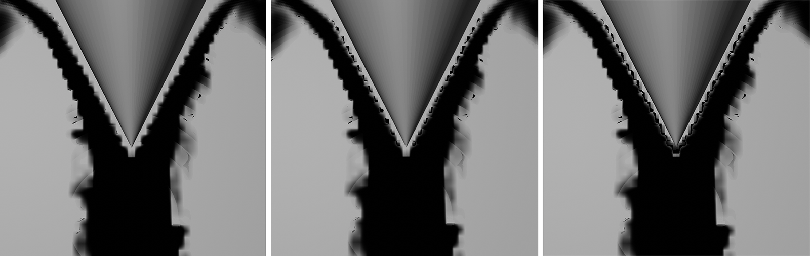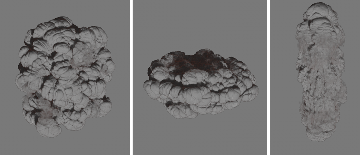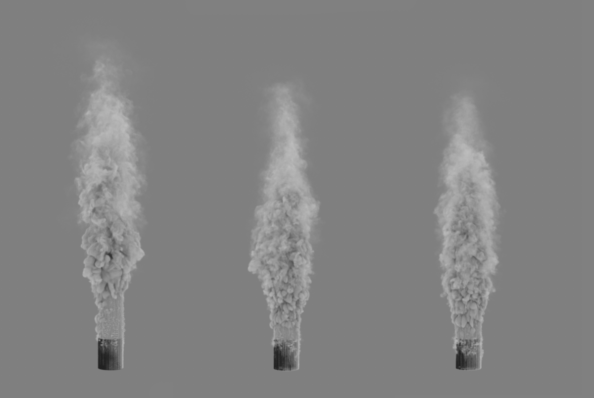 La taille des voxels est de 5 cm, Min. Sous-étapes 0 et Max. Sous-étapes 8 utilisées. Distance d'advection prévue (en voxels) 4 a été utilisé à gauche, 8 au centre et 16 à droite. Au fur et à mesure que la valeur augmente, la précision du calcul pour les images de simulation dans lesquelles des distances plus courtes que la taille du voxel * distance d'advection attendue sont couvertes diminue. Une précision de calcul moindre se traduit souvent par une extension plus importante de la simulation (voir diagramme du milieu et de droite).