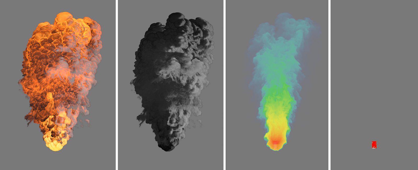 Cette série d'images montre, de gauche à droite, l'effet d'un seuil de température croissant. Dans chaque cas, les simulations ont utilisé une température de 4000 degrés à l'émetteur et des réglages de 1, 500, 1000 et 2000 pour le seuil de température. Cette augmentation progressive garantit que les températures ne restent visibles qu'à proximité immédiate de l'émetteur, où elles jouent un rôle dans la flottabilité de la densité.