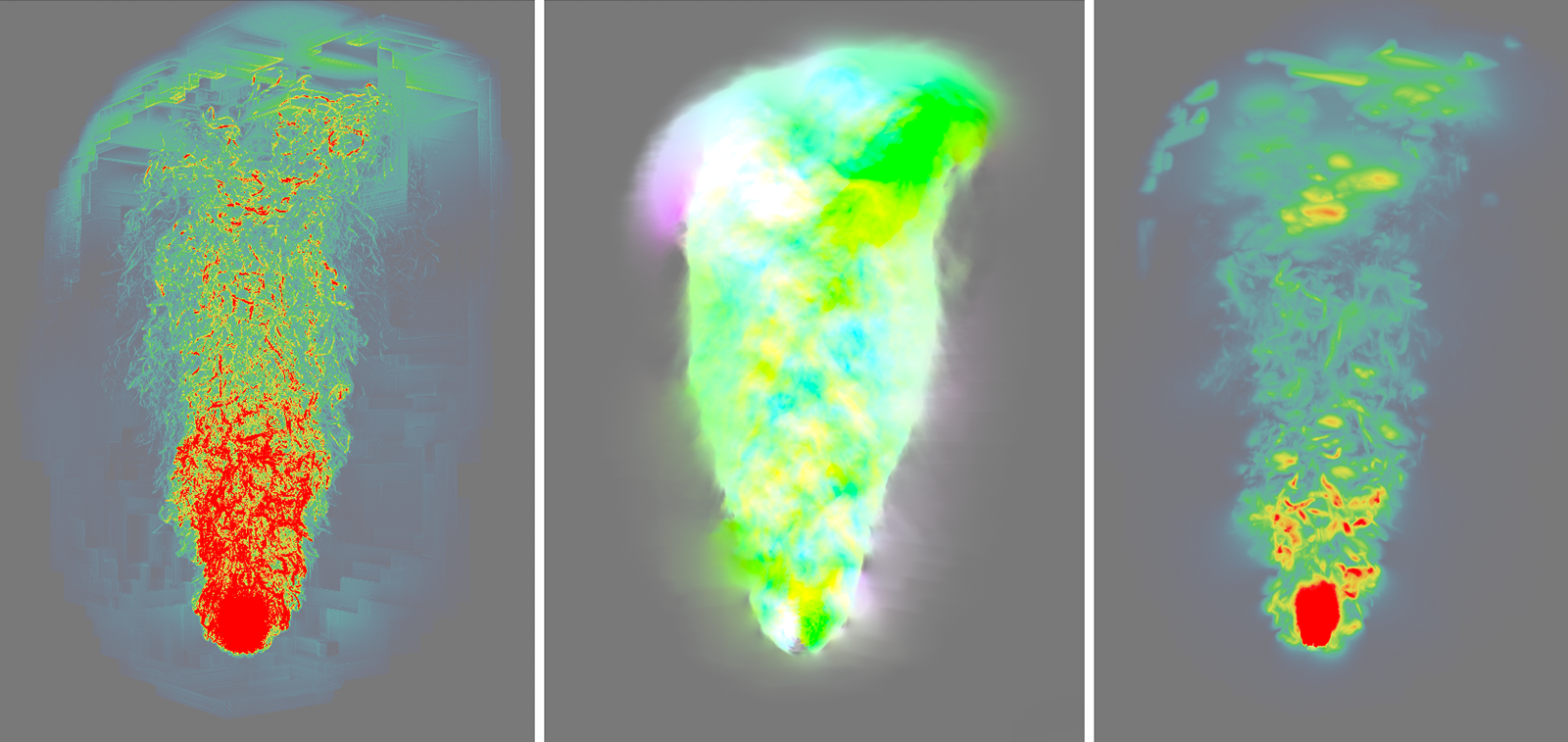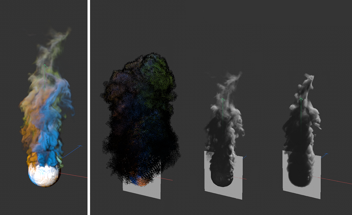 Deux simulations de fumée de couleurs différentes sont mélangées ici. Le mode compatibilité a été utilisé à gauche, le mode unique au milieu et le mode luminance perçue à droite.