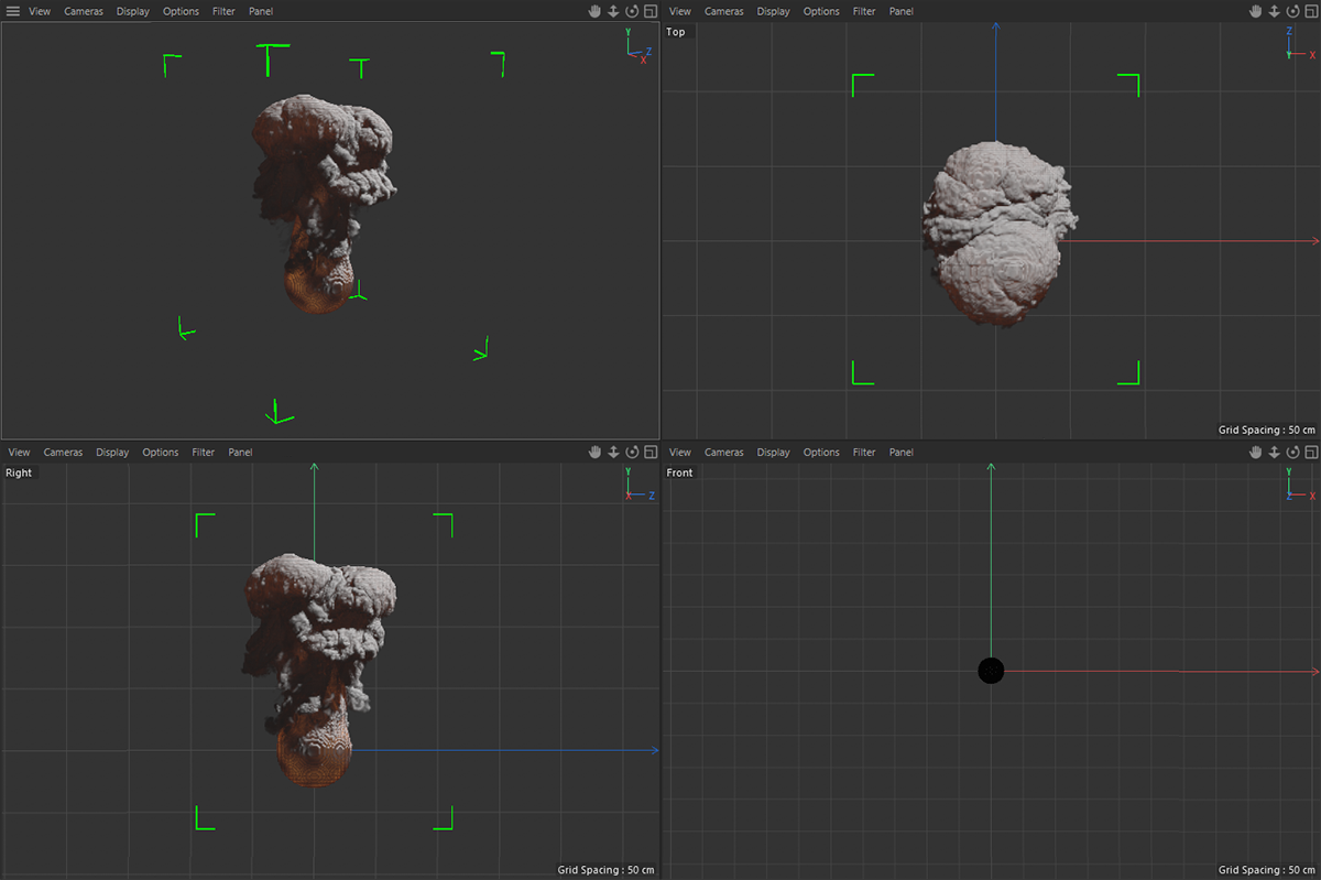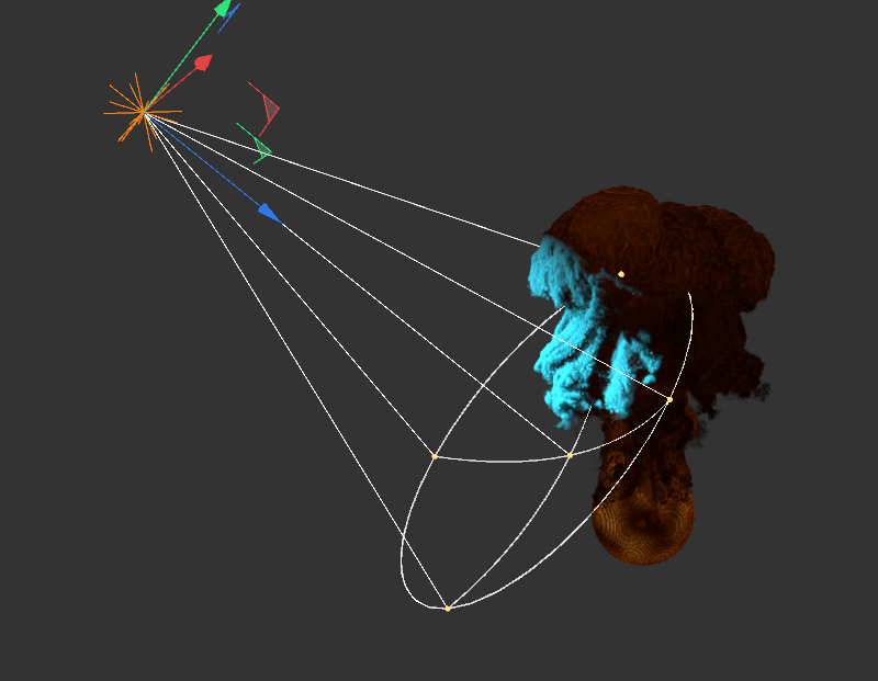 Dans ce cas, un cylindre a été défini comme l'émetteur et une certaine quantité de carburant y a été brusquement générée à l'aide de la méthode Intervalle image, qui est ensuite convertie en densité et en température. L'augmentation de la pression pendant la combustion crée le nuage d'explosion caractéristique.