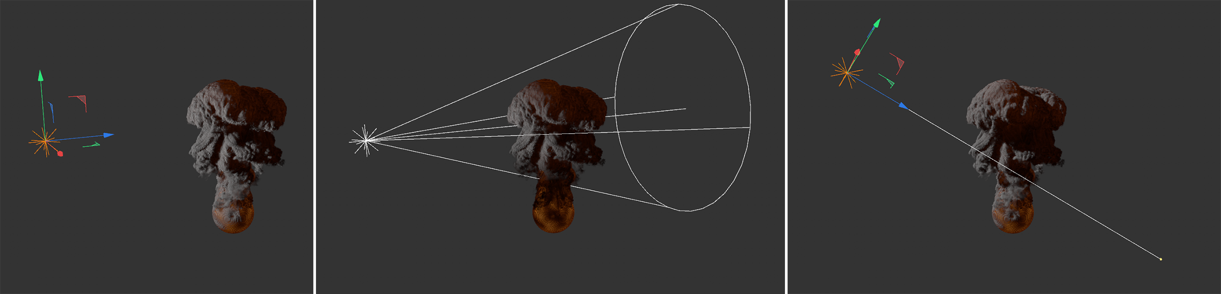 À gauche, une simulation colorée par une propriété Couleur de points, avec une sphère servant de volume d'émission. Au centre, un plan vertical s'est vu attribuer une propriété Émetteur Pyro et génère des informations sur la densité et la couleur. Si un cadre de simulation de la sphère est maintenant utilisé comme état initial pour cette simulation, les vitesses et les couleurs des deux simulations se mélangent au début de la simulation (voir l'image de droite).