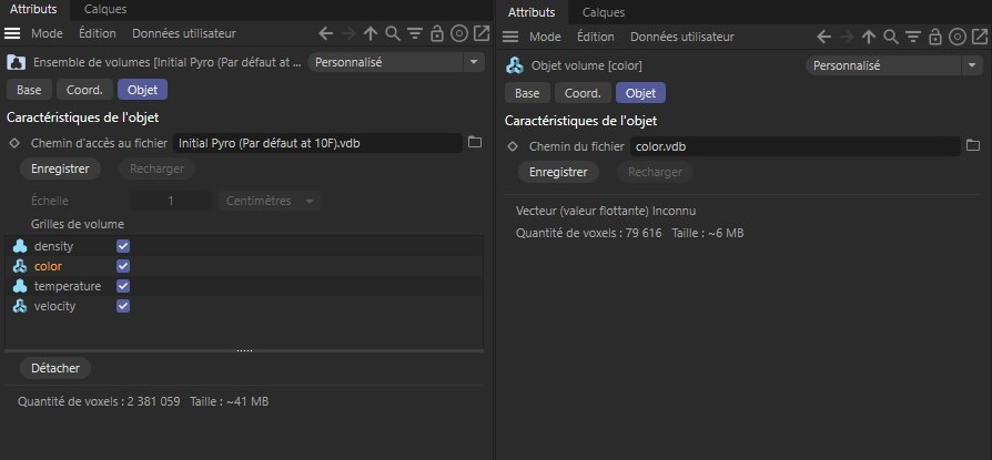 En cliquant sur ce bouton, vous créez un objet Volume initial défini. Cette fonction gère les données de simulation de l'image d'animation en cours, telles qu'elles sont générées par la propriété Émetteur Pyro ou Carburant Pyro. La façon dont ces propriétés ont été configurées dans les propriétés de l ' objet >Pyro n'a pas d'importance. Les propriétés marquées Désactivé sont également sauvegardées dans l'objet Ensemble de volume si elles sont utilisées dans la propriété Émetteur Pyro.