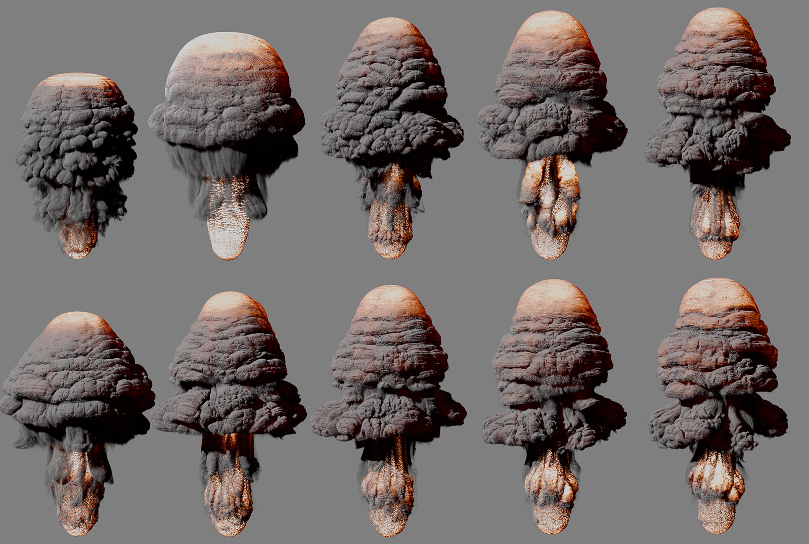 Seules les zones dont la température est supérieure à cette limite sont prises en compte dans la simulation. Utilisé judicieusement, ce paramètre peut donc améliorer la vitesse de simulation et les besoins en mémoire sans perdre de détails importants. En outre, des valeurs délibérément plus élevées peuvent également conduire à des résultats stylistiques intéressants. La figure suivante en donne un exemple. Vous trouverez également des seuils similaires pour la densité et le carburant.