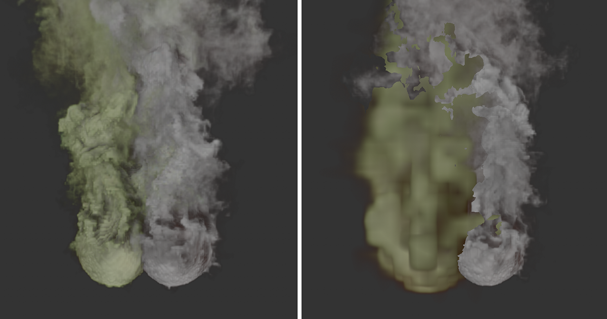Mais qu'en est-il si seule la fumée émise par l'une des deux sphères doit être calculée plus grossièrement ou tourbillonner différemment, par exemple ? Nous aurions besoin de paramètres pyro pour cela, que nous pourrions assigner individuellement à des propriétés pyro ou à des propriétés de carburant pyro.