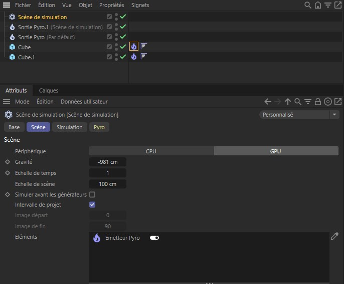 Après avoir appelé la scène de simulation, faites glisser l'une des étiquettes Pyro dans la liste des éléments. Cela crée un nouvel objet Pyro dans la scène(Pyro (Simulation Scene)), qui est maintenant associé à cette propriété Pyro. En outre, directement sur l'objet de la scène de simulation, vous trouverez maintenant un onglet Pyro avec tous les paramètres de simulation, qui peuvent maintenant être modifiés ici individuellement pour les éléments liés.
