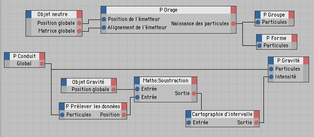 Nous avons simulé une gravité réaliste en changeant la force de gravité à mesure que le flux de particules se rapproche de l’objet Gravité. Avec cette méthode, vous pouvez par exemple, dévier un champ de petites météorites autour d’une planète. Utilisez le nœud Cartographie d’intervalle pour affiner l’influence de la distance sur la force de gravité.