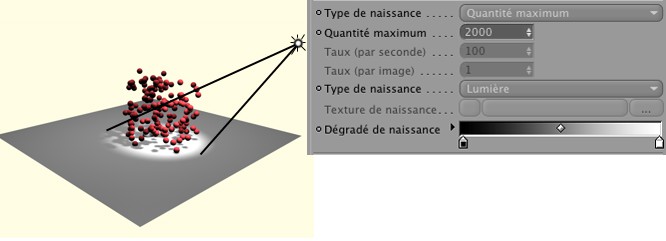 Les parties de l’objet complètement éclairées par ces lumières émettront des particules de taille maximum alors que les parties faiblement éclairées ou non éclairées émettront des particules de taille 0.