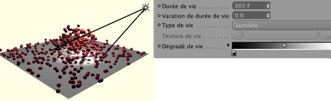 Dans ce mode, vous pouvez utiliser les lumières et une image ou une matière pour contrôler la durée de vie. Une surface va émettre des particules de durée de vie maximum uniquement si elle est complètement éclairée par les lumières et si elle reçoit une couleur blanche de la part de la texture ou de la matière.