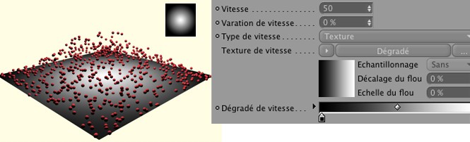 Dans ce mode, vous pouvez utiliser les lumières et une image ou une matière pour contrôler la vitesse. Une surface va émettre des particules de vitesse maximum uniquement si elle est complètement éclairée par les lumières et si elle reçoit une couleur blanche de la part de la texture ou de la matière.