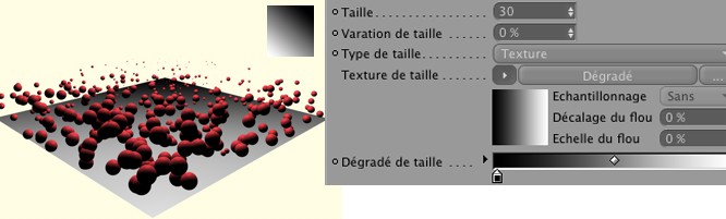 Dans ce mode, vous pouvez utiliser les lumières et une image ou une matière pour contrôler la taille. Une surface va émettre des particules de taille maximum uniquement si elle est complètement éclairée par les lumières et si elle reçoit une couleur blanche de la part de la texture ou de la matière.