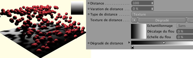 Dans ce mode, vous pouvez utiliser les lumières et une image ou une matière pour contrôler la distance. Une surface va émettre des particules de distance maximum uniquement si elle est complètement éclairée par les lumières et si elle reçoit une couleur blanche de la part de la texture ou de la matière.