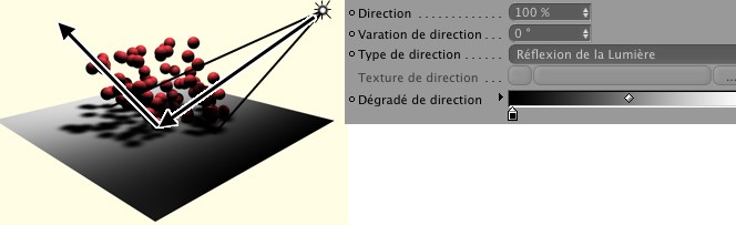 Ces paramètres se basent sur la lumière ou la texture pour le contrôle de la direction des particules, lorsqu'elles quittent la surface de l'objet.