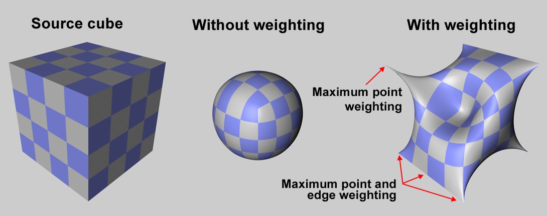 Trois modes sont disponibles : Point, Arête et Polygone (notez que l’influence peut ne pas fonctionner en fonction de l’algorithme qui est utilisé - et à l’inverse de ce que montre Catmull-Clark sur l’image ci-dessous).