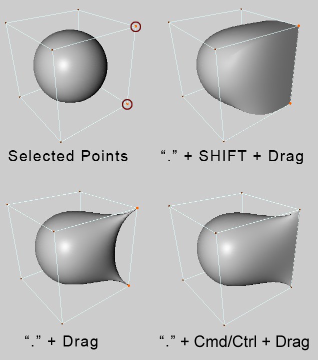 Points sélectionnés. ‘.’ + glisser. ‘.’ + Maj-glisser. ‘.’ + Cmd/Ctrl-glisser.