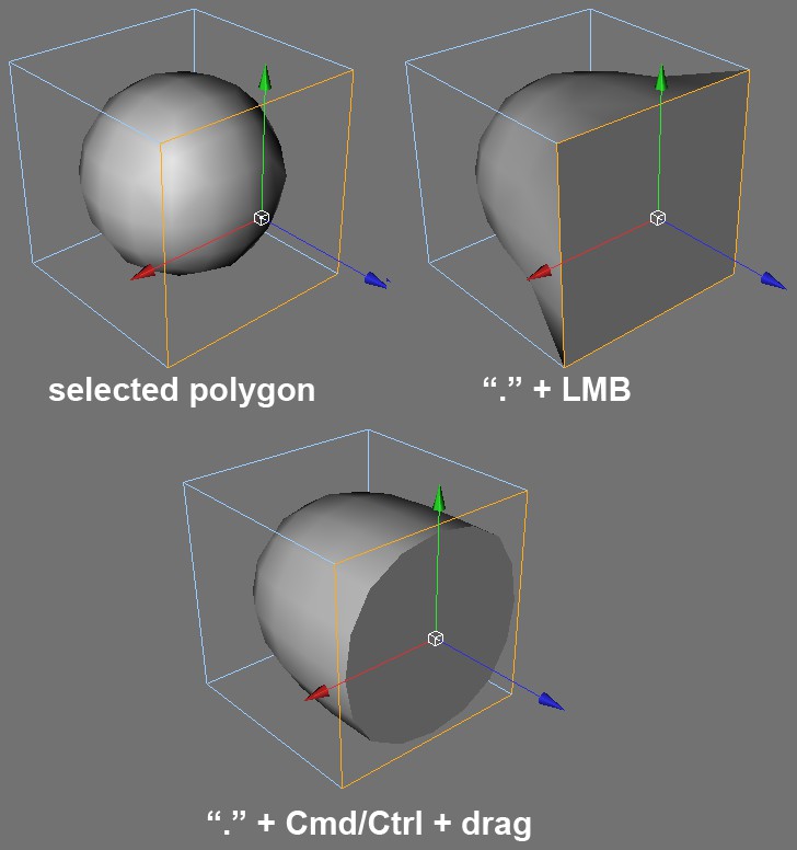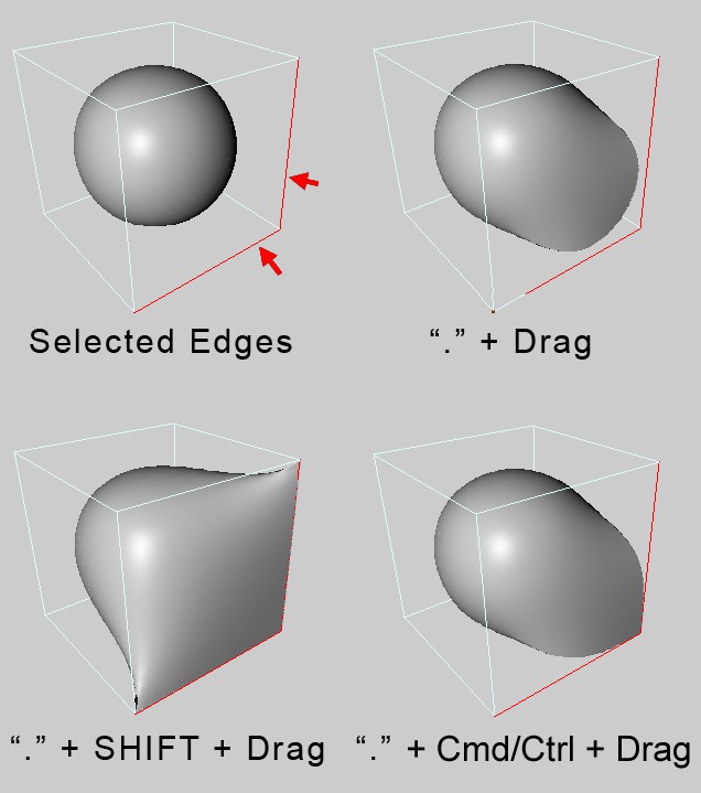 Arêtes sélectionnées. ‘.’ + glisser. ‘.’ + Maj-glisser. ‘.’ + Cmd/Ctrl-glisser.