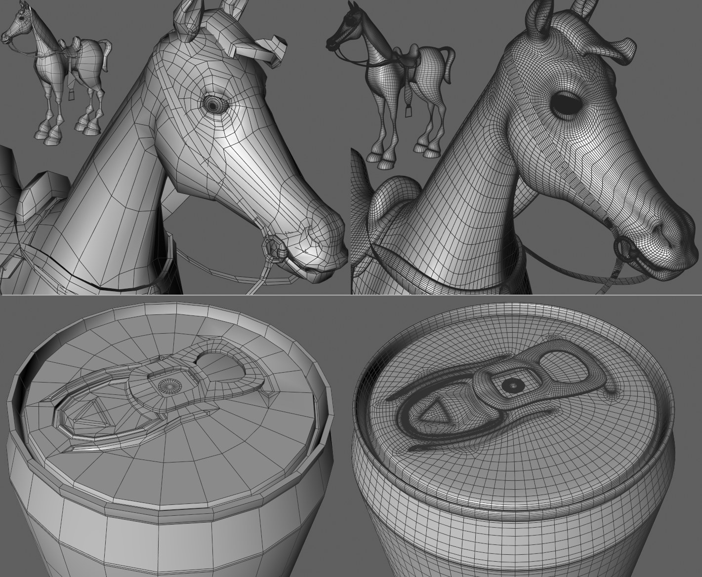A gauche de l’image ci-dessus, vous avez les objets maillage modélisés et à droite, les mêmes modèles qui ont été lissés avec un objet Surfaces de subdivision. Vous pouvez également modéliser des modèles techniques aux arêtes aigües. Sur les objets Surfaces de subdivision, les arêtes aigües se trouveront toujours aux endroits où la géométrie est détaillée. Les arêtes aigües seront aussi créées où les arêtes parallèles se trouvent très près les unes des autres où la géométrie forme une courbe. La canette sur l’image ci-dessus a été créée en utilisant une basse résolution Révolution objets. Nous avons autorisé les modifications de l’Objet polygonal puis nous l’avons ajusté à l’aide des outils structure. L’onglet qui s’ouvre est un objet séparé.