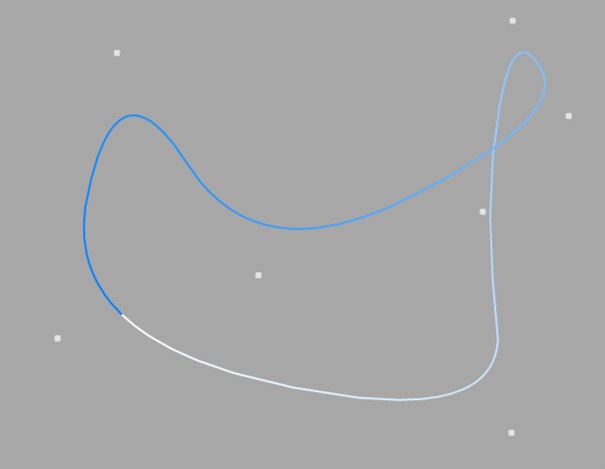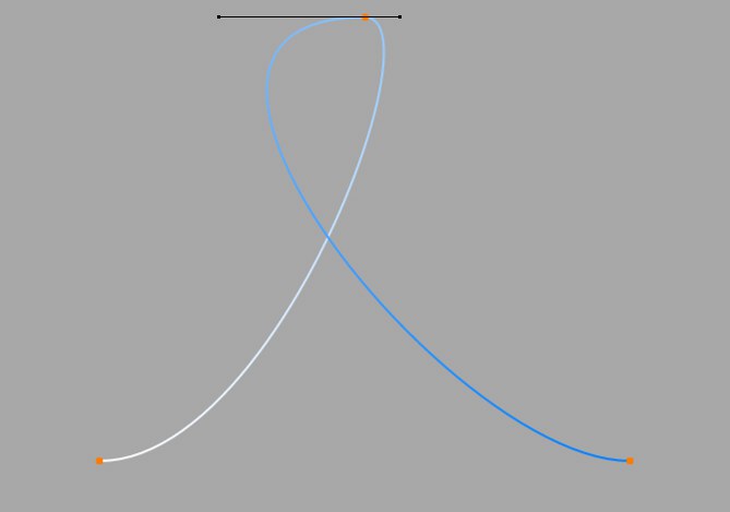En ajustant la longueur des poignées des tangentes, vous pouvez contrôler l’intensité de la courbure. Déplacez le dernier point de la tangente vers un autre point et observez le mouvement symétrique de la poignée opposée.