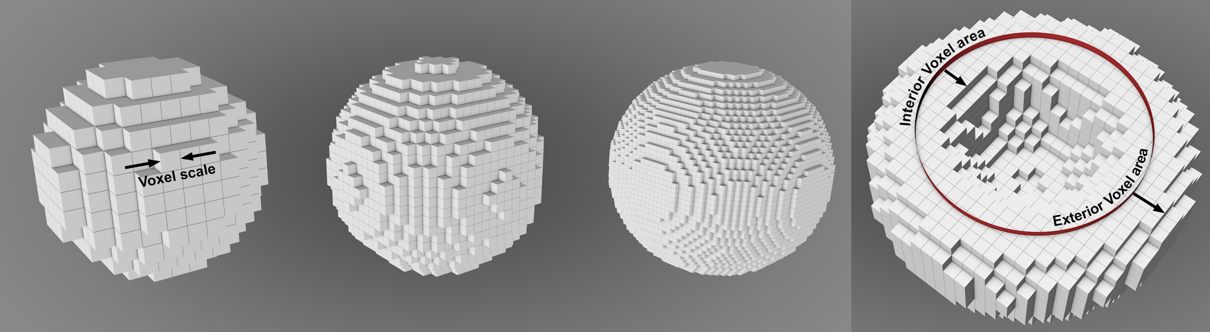 Section de gauche : Plus la Taille de voxel est petite, plus la forme de la sphère sera précise ; À droite : Les calques de voxels sont générés sur les surfaces internes et externes de la forme.