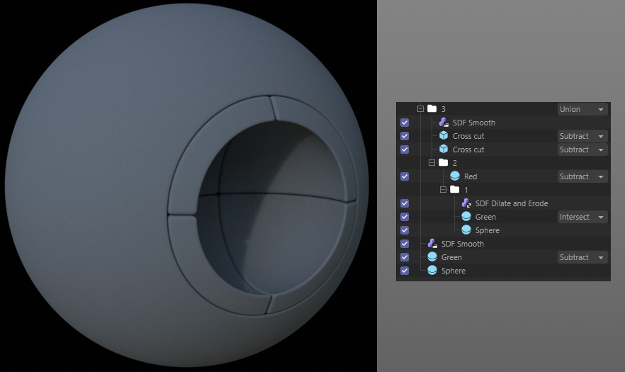 - . Rayon: (uniquement pour le type de volume Distance Field (SDF)). Si des valeurs supérieures à 0 sont définies ici, des rayons seront ajoutés en conséquence aux arêtes des opérations booléennes. Vous pouvez utiliser ceci pour créer des transitions douces entre les objets combinés