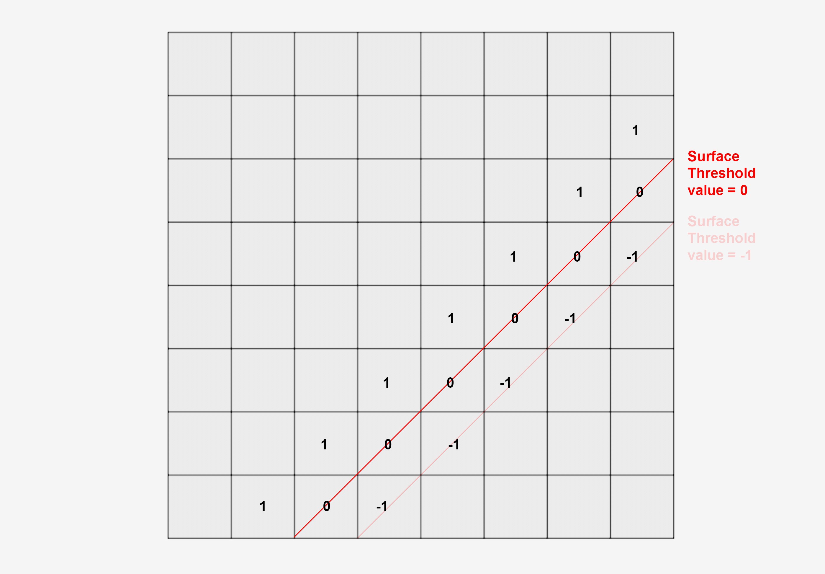 Dans l’image ci-dessus, une valeur de Seuil de surface de 0 générera des surfaces de polygone parcourant des Voxels d’une valeur de 0. Si vous imaginez la grille comme une grille tridimensionnelle et que vous autorisez en outre les interpolations entre les valeurs (par ex. Seuil de surface = 0,5), cela vous donnera un bon aperçu du fonctionnement du paramètre Seuil de surface.