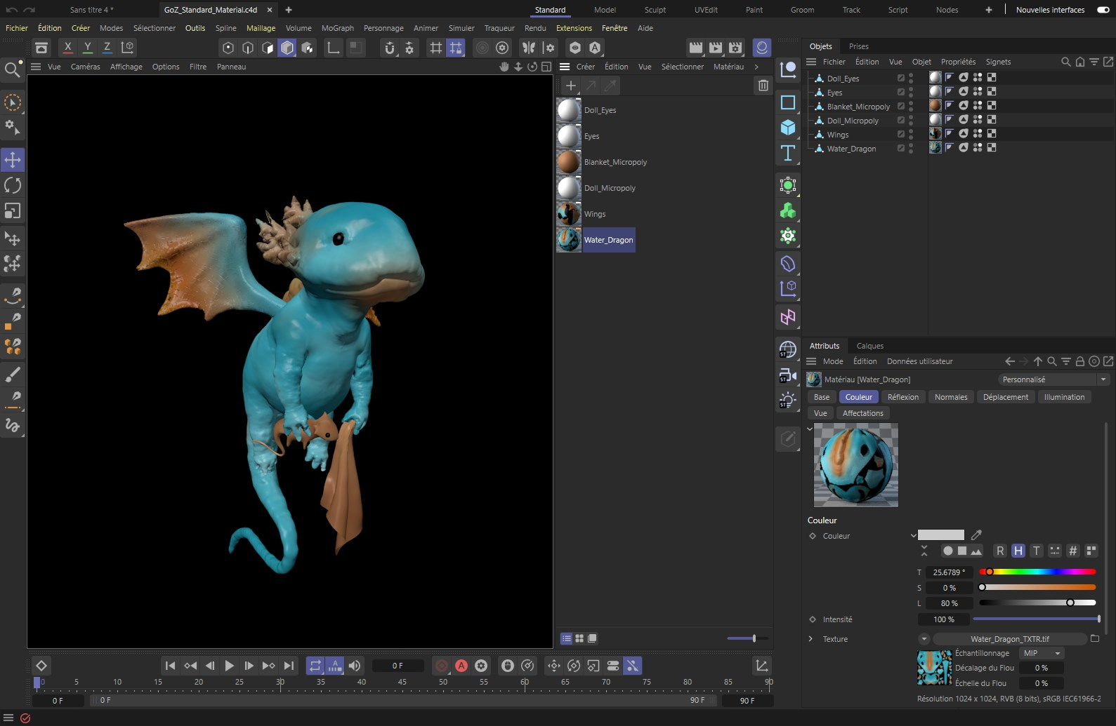 Lors de l'utilisation de matériaux standard ou physiques, les textures ZBrush seront automatiquement chargées dans les canaux de matériaux appropriés. Ceci est également visible dans le gestionnaire d'attributs dans l'image ci-dessus.