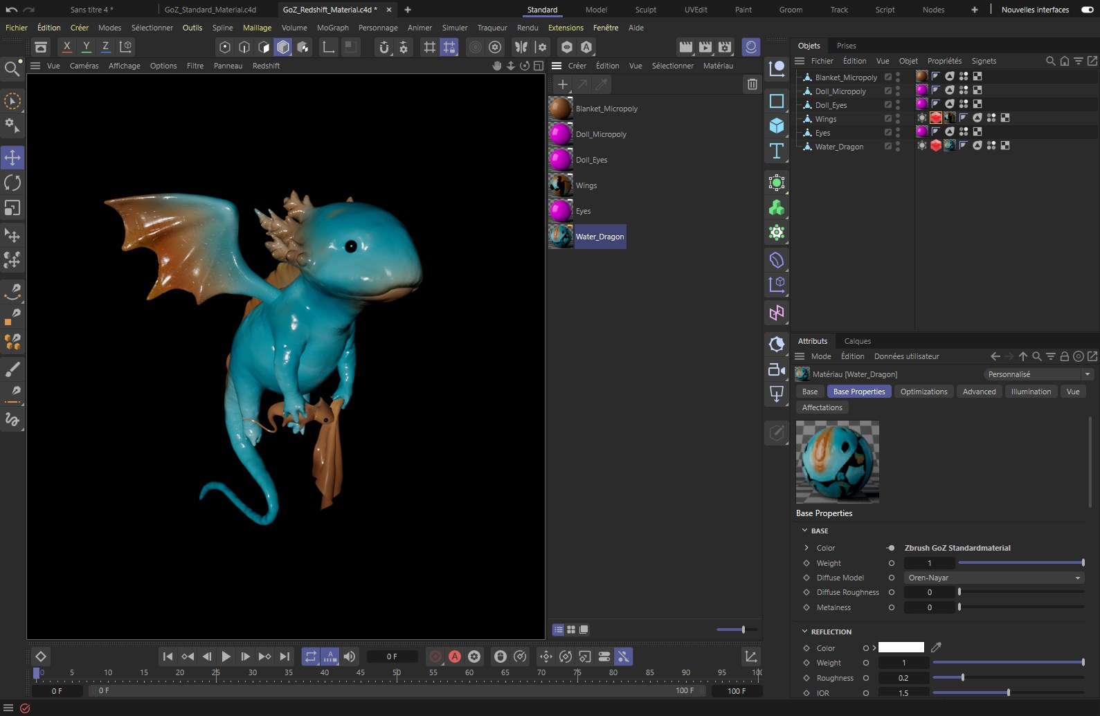 Les Propriétés Redshift Object nécessaires à l'affichage du déplacement seront automatiquement créées sur les objets lors de l'importation depuis ZBrush si des textures de déplacement ont été détectées sur les objets. Le nombre de subdivisions sera également calculé automatiquement et sera déjà inscrit sur ces étiquettes. L'image suivante montre un exemple d'affichage de la scène ZBrush dans Cinema 4D avec Redshift.