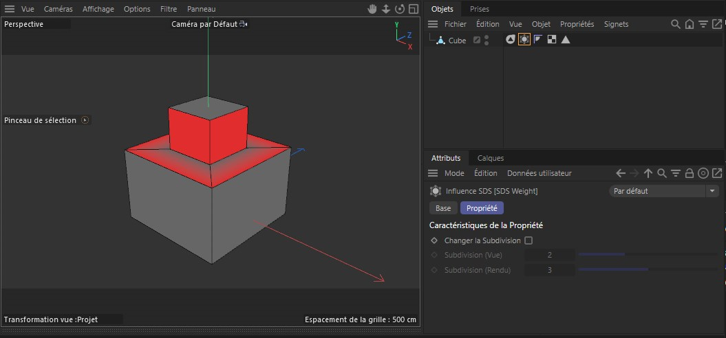 Les informations de pondération seront stockées sur l'objet dans une Propriété Influence SDS, qui peut également être utilisée dans la fenêtre de visualisation pour une superposition colorée des pondérations. Comme le montre l'image ci-dessus, seule la propriété Influence SDS doit être sélectionnée. Dans ce cas, les arêtes horizontales du modèle ont été pondérés à 100 %.