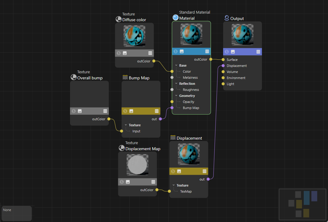 Si Redshift est utilisé pour le rendu et a également été sélectionné comme cible pour la création de matériaux, des matériaux Node seront créés dans lesquels les textures seront également intégrées automatiquement en les liant de manière appropriée à un matériau standard Redshift :