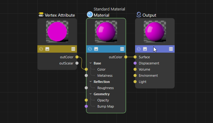 Les informations PolyPaint disponibles sur les objets sont stockées dans les Propriété Couleurs de points et seront automatiquement lues à partir de celles-ci à l'aide du nœud Vertex Attribute Redshift et interprétées comme une couleur de matériau, comme le montre l'image suivante.