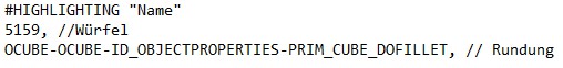 Ctrl/Cmd+Alt+clic droit sur un paramètre et sélectionnez ID to Clipboard (Feature Highlight). Cette action chargera le texte suivant dans le cache : OCUBE-OCUBE-ID_OBJECTPROPERTIES-PRIM_CUBE_DOFILLET, // Fillet.