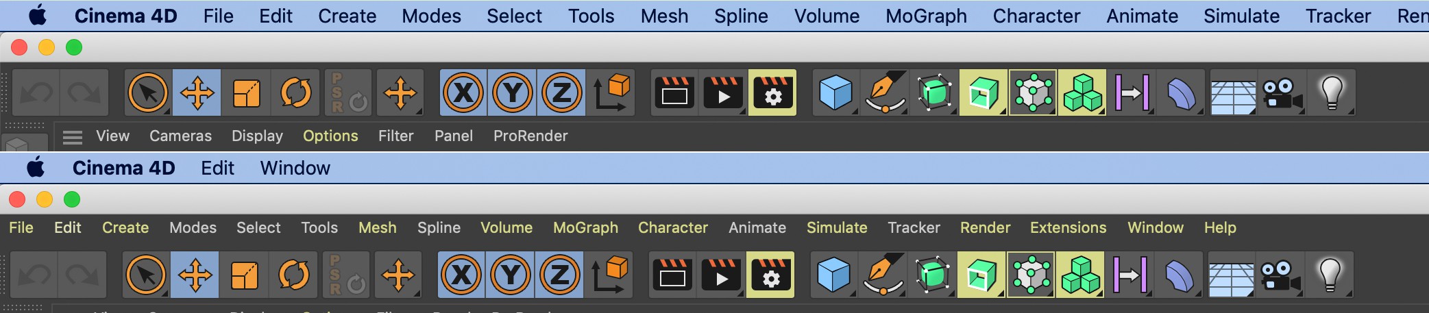 Cinema 4D peut désormais afficher la barre de son menu principal comme barre de menu Mac sous macOS (option activée : en haut de l’image d’exemple) ou comme sous l’ancienne version (option désactivée : au bas de l’image d’exemple).