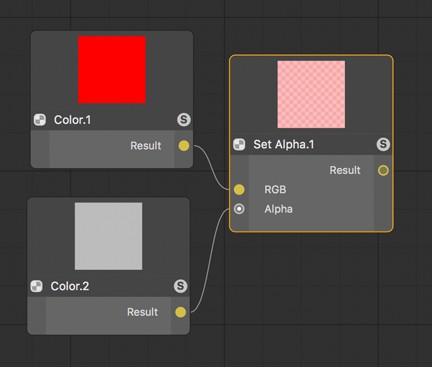 Les couleurs peuvent aussi contenir des informations à propos de leur opacité, par ex. le composant alpha. Si celle-ci doit être remplacée ou redéfinie, le Nœud Configurer Alpha peut être utilisé.