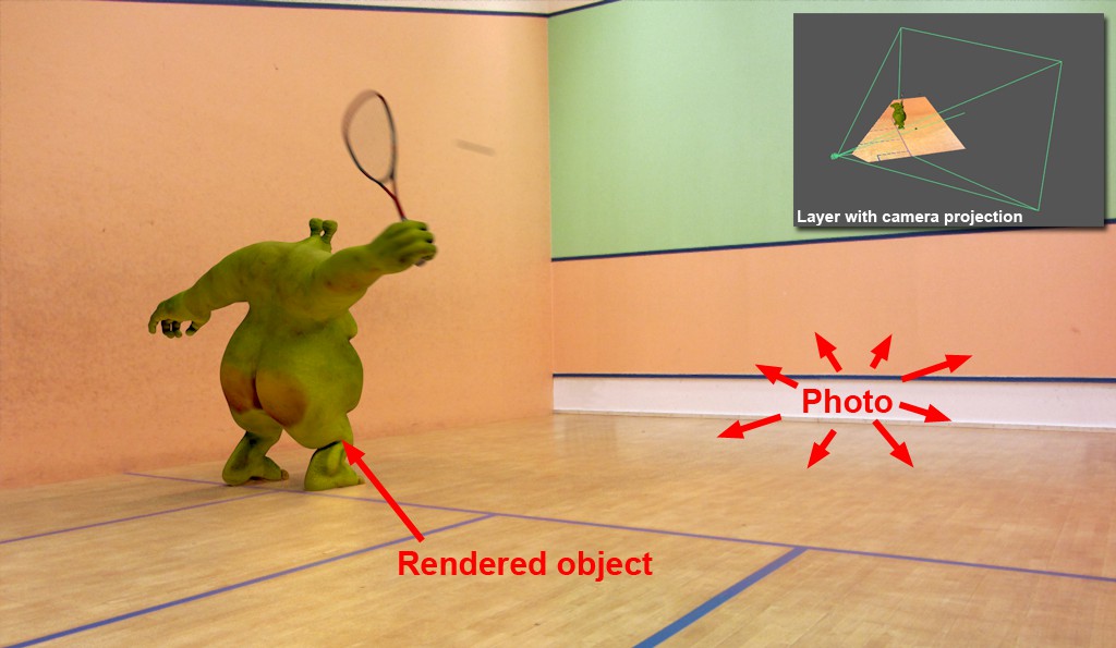 Grâce à la caméra calibrée et au compositing, le petit monstre qui joue au squash ressemble à de vraies photos.