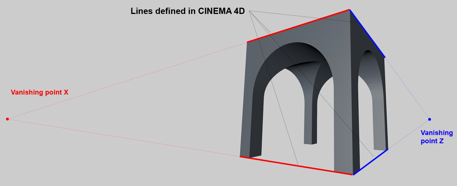 Pour la reconstruction, CINEMA 4D requiert 2 points de fuite et 2 plans séparés à la verticale. Pour définir les points de fuite, les parallèles doivent être tracées sur l’image (lorsqu’elles sont affichées dans une vue de perspective, ces lignes créeront un point de fuite) :