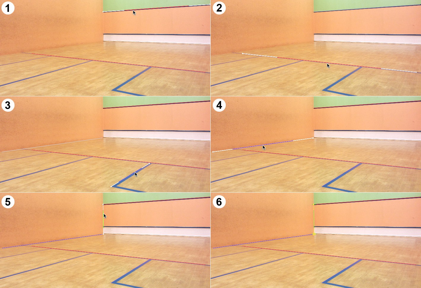 - Procédez de la même façon pour les lignes de l’axe Z. Ajoutez 2 lignes et disposez-les sur le sol (3) et le long du mur (4). Faites Shift+cliquez sur chaque ligne jusqu’à ce qu’elles deviennent bleues (axe Z). Les points de fuite sont enfin définis et la distance focale ainsi que l’angle de la caméra peuvent être calculés. Les paramètres correspondants seront en jaune et vert dans le panneau Calibreur de caméra.