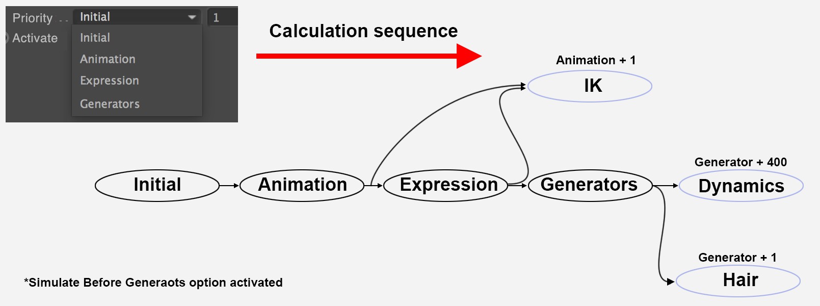 Séquence de calculs des différentes fonctions. Les priorités internes de certaines fonctions sont également affichées.Les simulations (par exemple, priorité Générateur +400) définit ces priorités en interne. Il est impossible de les modifier. Par exemple, les expressions pointant vers un objet déformé par une simulation nécessitent une priorité d'au moins Générateur +401.