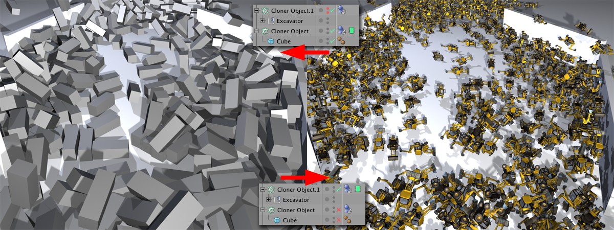 Les propriétés MoGraph conformées peuvent être copiées / déplacées vers d’autres objets cloneurs (qui doivent également posséder une propriété Corps rigide). Cela est très pratique si vous calculez rapidement l’effet d’un effecteur ou une simulation Modynamics utilisant un objet de substitution (exemple : simples cubes). Ils seront alors conformés et la propriété attribuée à un objet cloneur similaire, qui contiendra un objet polygonal haute résolution qui sera rendu.
