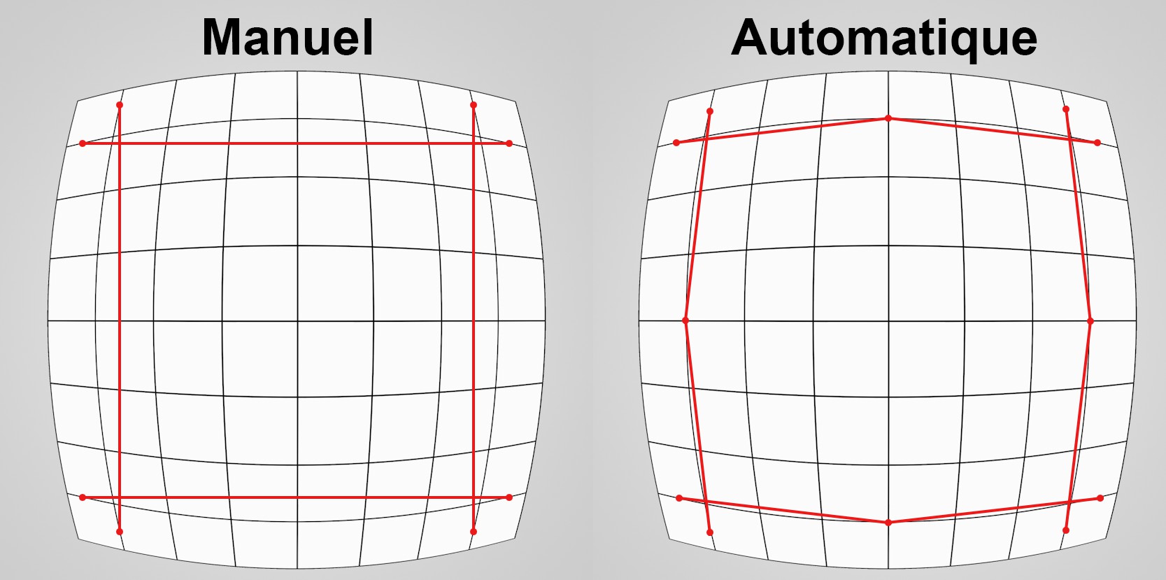 - Automatique : cette méthode est beaucoup plus simple et recommandée. Les guides sont positionnés avec plusieurs points sur les côtés déformés, c’est-à-dire courbés, des images. Une fois que suffisamment de guides ont été positionnés, l’image peut apparaître sans distorsion. Tous les paramètres respectifs de la distorsion de l’objectif seront modifiés en conséquence.