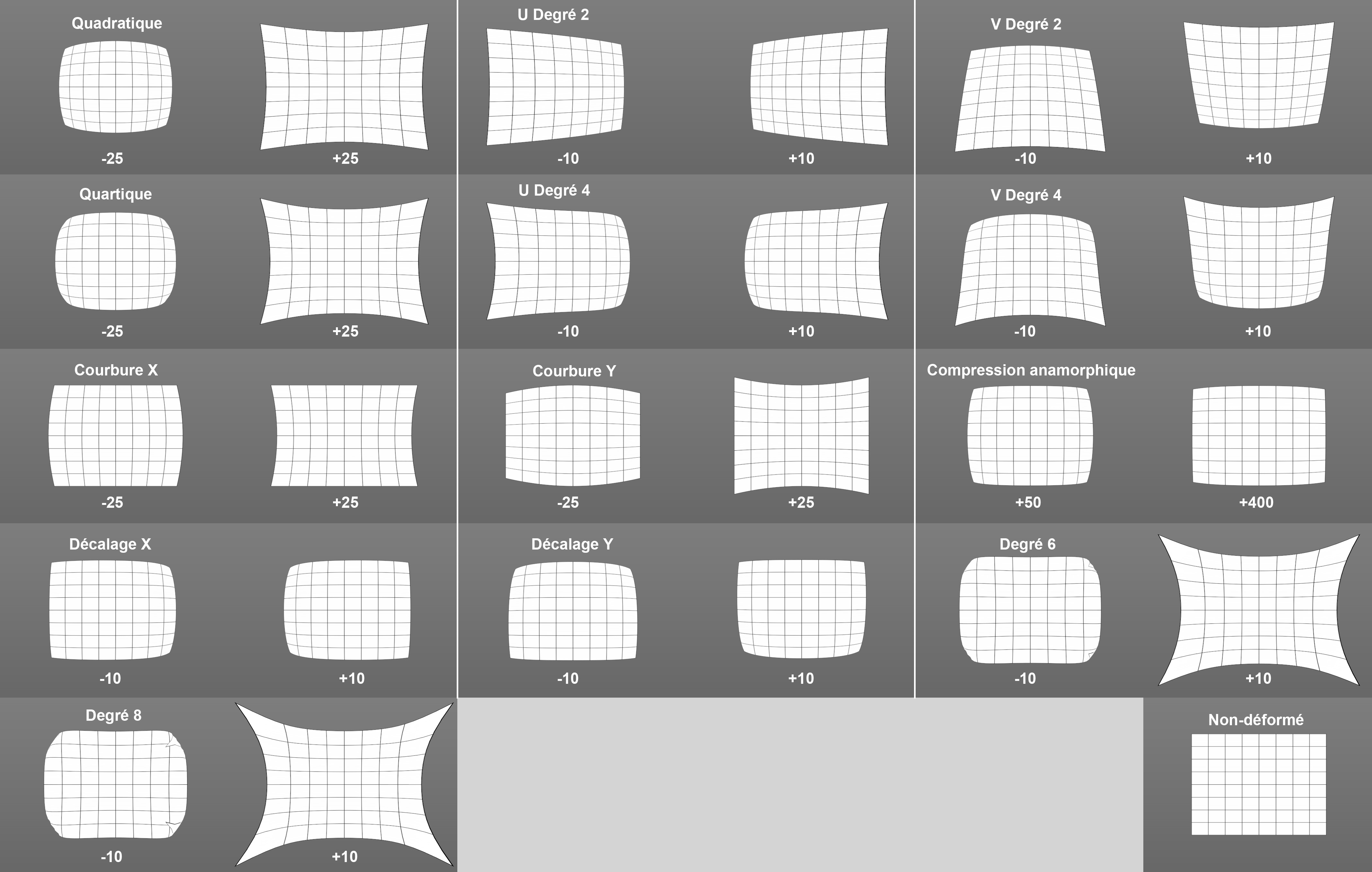 Si ces noms vous semblent familiers, c’est parce qu’ils proviennent du module Distorsion de l’objectif de Science-D-Vision (qui était aussi utilisé pour la fonctionnalité de la distorsion de l’objectif). Leur nom n’a pas été modifié, ce qui évite toute éventuelle confusion.