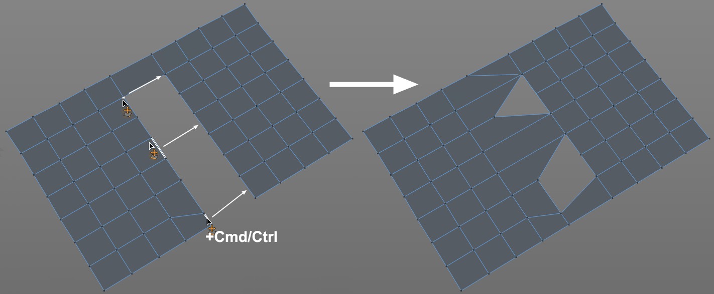 - Ctrl (Windows) / Cmd (Mac) + cliquez sur un élément : fusionne ou supprime l’élément. Les points ou les arêtes externes seront toujours supprimés ou fusionnés. Les polygones seront toujours supprimés.