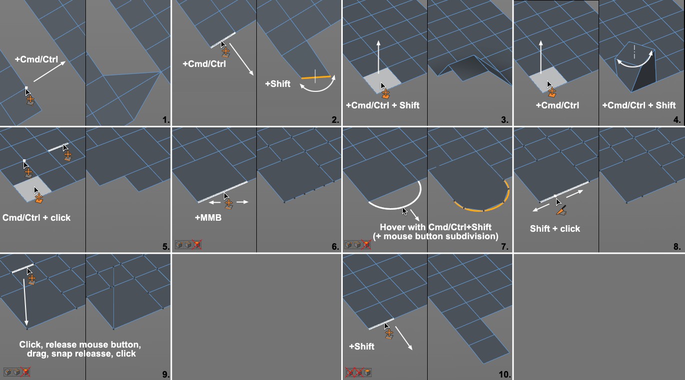 - Raccourci disponible uniquement en mode Polygone : Maj + cliquez sur une arête : déroule une bande de polygones composés de carrés égaux (pour ce faire, activez le mode peinture [[Polygones||).