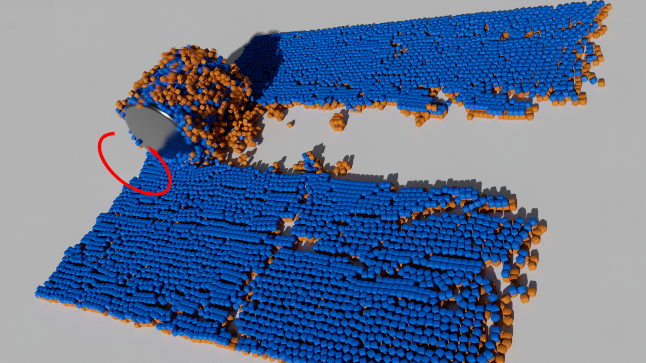 Par exemple, lorsqu'un cylindre collant roule sur une telle pile de corps rigides, l'effet illustré se produit.