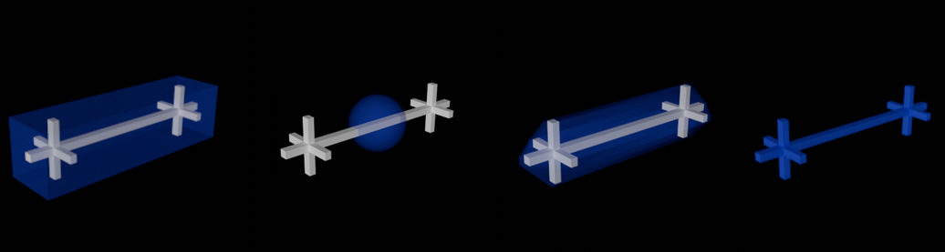 De gauche à droite : Formes de collision en bleu : boîte, sphère, coques convexes (précision géométrique = 0, mais peut être grandement améliorée avec des valeurs plus élevées), maillage de triangles.